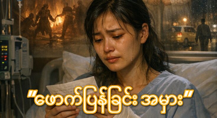 ဒါကတော့ သူပေးထားခဲ့တဲ့ စာလေးပါ”” ဆရာဝန်မ ပေးခဲ့သော စာကို ကျမ စိတ်ဝင်တစားနဲ့ အလျင်တလို ဖွင့်ဖတ်လိုက်မိတယ်။ …သို့ ………မိုး… လိမ်လိမ်မာမာ နေနော် နေကောင်းအောင်နေ ကျန်းမာရေး ဂရုစိုက် … မောင် နှုတ်ဆက်ခဲ့တယ်… အချစ်သစ်နဲ့ ဘဝသစ်မှာ ပျော်ပါစေ မိုးရေ… ……..ချစ်သော မောင်… မောင် ရေးထားခဲ့တဲ့စာက တိုလွန်းပေမယ့် ကျမရင်ကို စူးနစ်စွာ ဝင်ရောက်ခဲ့တယ်။ ဪ…မောင်ဟာ ကျမ အကြောင်း အကုန်သိနေပေမယ့် မသိချင်ယောင် ဆောင်နေခဲ့တာပါလား ကျမ မှားခဲ့ ပေမယ့် နောက်ဆုံ အချိန်ထိ ကျမကို ခွင့်လွှတ်နား လည်ပေးခဲ့ပါလား ကျမ လို သစ္စာ မရှိတဲ့ မိန်းမ တစ်ယောက်ကို ဆေးရုံ အထိ မောင်လာပို့ ခဲ့တာတဲ့ ပြီးတော့ ဆေးကုစရိတ်တွေပါ ပေးထားခဲ့တယ်။