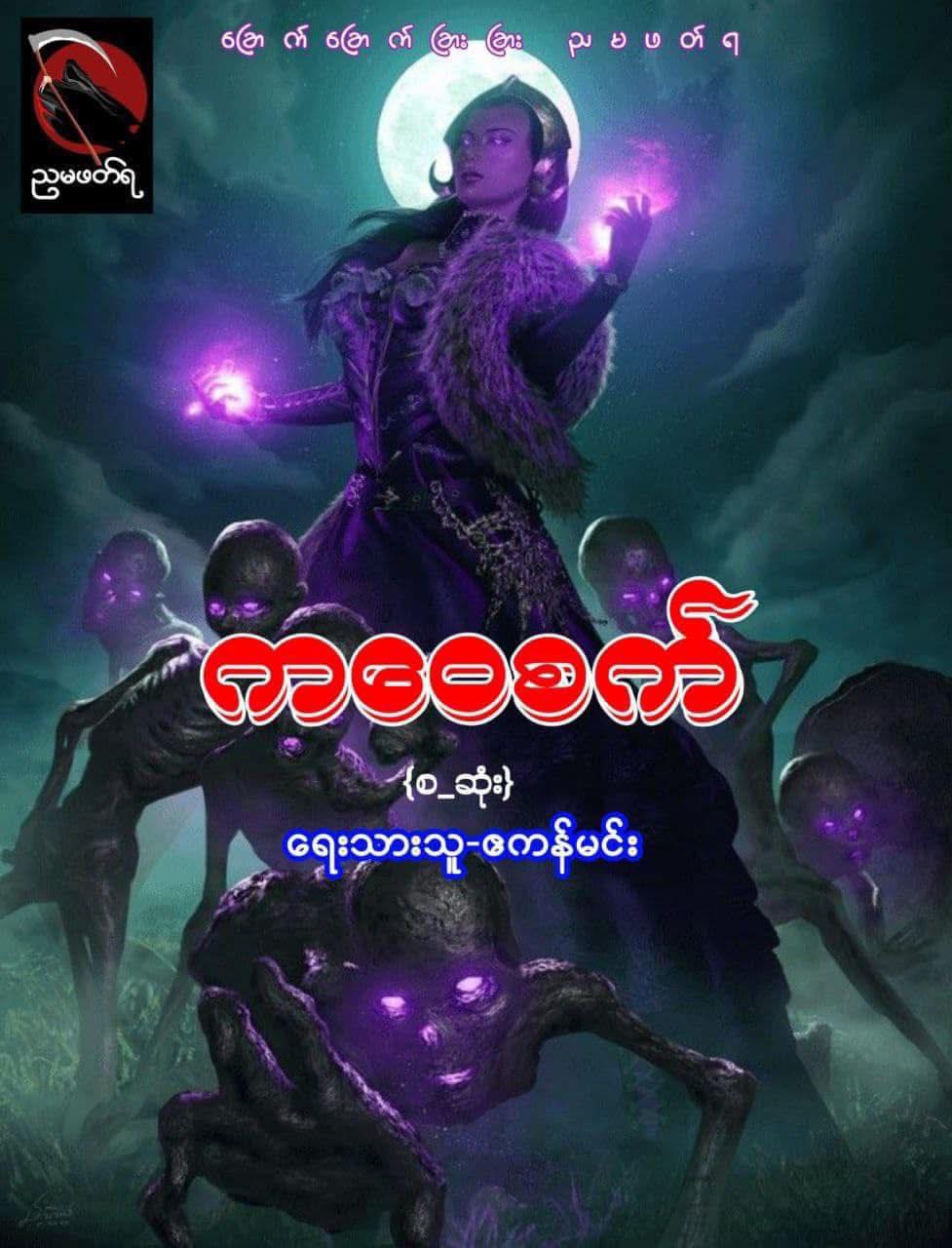 “ကဲ …ပွဲစတော့မယ်၊ ကောင်မနှစ်ကောင် မီးလိုက်ညှိလိုက်” “ကောင်မသုံးကောင် ပတ်ပတ်လည်မှာ မလစ်ဟင်းရအောင် ကင်းစောင့်ကြ ဘာအနှောင့်အယှက်မှ မရှိချင်ဘူး” “ဟုတ်ကဲ့ သခင်မနဲ့ သခင်ကြီး” စုန်းမကြီးသုံးယောက်က ရိုရိုသေသေပြန်ဖြေပြီး သူတို့၏ ထဘီတွေကို ဖြန့်ပြီး ခြုံလိုက်တော့သည်။ “မောင်အေးဝင်း …သူတပည့် စုန်းမတွေ ကင်းလှည့်စောင့်ကြပ်နေပြီ၊ သူတို့ပညာ အစွမ်းကုန်အသုံးပြုတော့မယ်၊ သူတို့ရဲ့ မှော်ကဝေပညာကို အစွမ်းကုန်အသုံးချပြီး လူသေအလောင်းကို အသက်သွင်းလိမ့်မယ်၊ အသက်သွင်းတဲ့ကိစ္စ မအောင်မြင်အောင် ဖျက်ဆီးရမယ်၊ အောင်မြင်သွားလို့ကတော့ ဝိညာဉ်တွေကိုခိုင်းစားကြတော့မယ်၊ လူတွေလည်း ပိုပြီး လှည့်ဖျားတာ ခံရတော့မယ် ” ကဝေယောင်္ကျားက အလောင်း၏ ခေါင်းရင်းက ထိုင်ပြီး ကဝေမက ခြေရင်းက ထိုင်သည်။ သူတို့ပိတ်ပတ်လည်မှာ မီးထွန်းထားသော ဖယောင်းတိုင်များက အလျှံငြီးငြီးတောက် လောင်နေသည်။ ကဝေထီး၏ ပါးစပ်မှ အဖြူရောင်စက်များ အလောင်းပေါ် ထိုးဆင်းသွားသလို ခြေရင်းရှိ ကဝေမ၏ မျက်လုံးနှင့် ပါးစပ်တို့မှ အဖြူရောင် စက်များ တလက်လက်နှင့် ထွက်သွားသည် ထိုစဉ် ပတ်ပတ်လည်မှာ ထွန်းထားသော ဖယောင်းတိုင်မှ မီးများလည်း အပေါ်သို့ တစ်တောင်နီးပါး ဝုန်းခနဲ ဝုန်းခနဲ လောင်တက်သွားသည်။ ထို့နောက် မီးညွှန့်များက ဖြည်းဖြည်းစုသွားပြီး အပေါ်သို့ ထိုးတက်သွားသည်။