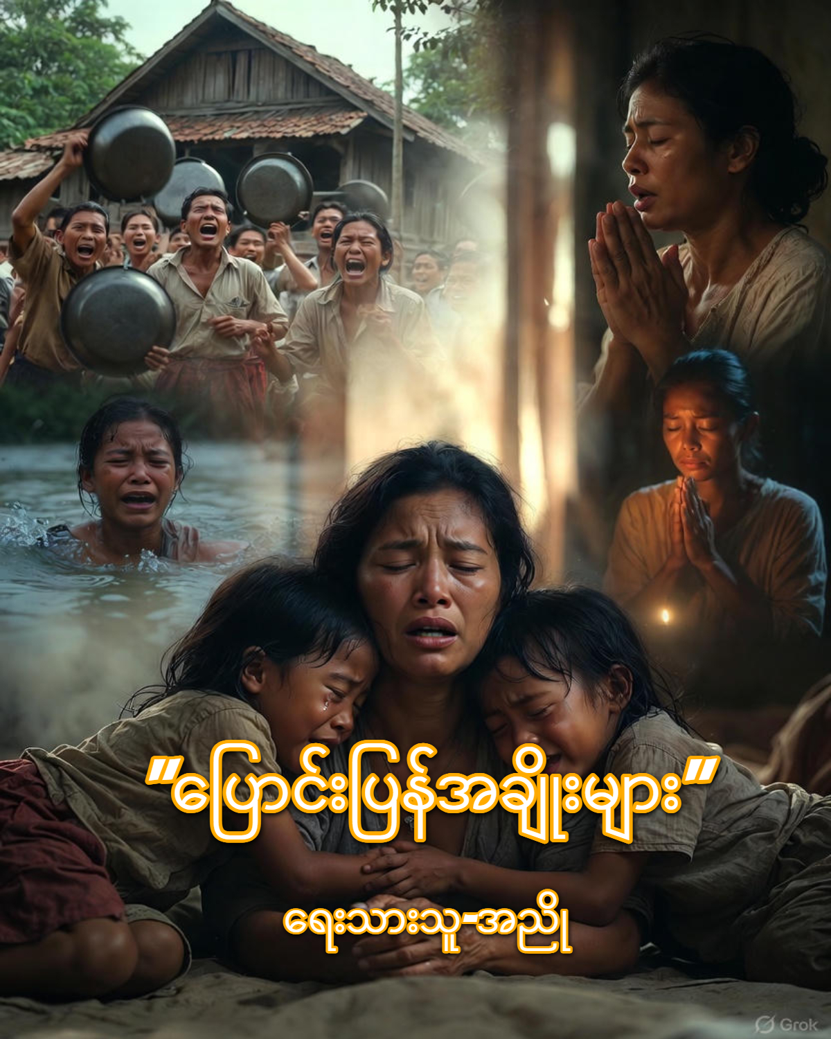 အညိုကျုပ်ဖြင့်လေ..တပါတ်လောက်သေကြည့်ချင်တယ်။ အဟုတ်။ဘာလို့လည်းမမေးပါနဲ့တော်…။ဒီကလေးတွေကြောင့်ရော ..ဒီလင်ကြောင့်ရောပေါ့။တစက်ကလေးမှ စိတ်မချရ..စိတ်မအေးရဘူး။ဘယ်သူရှိမတုန်း ။ အကြီးကောင်ဖိုးချစ်လေ၊မအေကရှိစုမဲ့စုနဲ့ သူတို့ကိုပညာတတ်ဖြစ်စေချင်လွန်းလို့ ကျောင်းလွှတ်လိုက်ပါတယ်ဆိုမှ ဒင်းကကျောင်းပြေးပြီး ရေသွားကူးသတဲ့။ ကျုပ်လိုက်သွားလို့ပေါ့ …။ကျုပ်သာမလိုက်ရင် ဒင်း မသာဖြစ်ပြီ။ဘာဖြစ်တယ်..။ကူးပါစေ ဟုတ်လား..။အခုဘာဖြစ်ခဲ့တယ်မှတ်တုန်း ။ရေနစ်နေတာလေ..ရေနစ်တာတော့ ။ကျုပ်တောင် ချောင်းစပ်ရောက်မယ်မကြံသေးဘူး…သူနဲ့အတူကူးတဲ့လူတွေက ဖိုးချစ်ရေနစ်လို့ ကယ်ကြပါဦးဆိုတာနဲ့ ဘယ်ရမတုန်း ။မိတင်လေ….ရေထဲကို ထမီပြင်ဝတ်ပြီးခုန်ချပစ်တာပဲ။ သူ့ကို ဟိုးရေအောက်ကနေ မနည်းဆွဲထုတ်ရတာလေ။အောက်မှာ ကြာပင်ရဲ့နွယ်တွေနဲ့ပတ်လို့ကတော့ သေပြီပဲ ။ ကျုပ်မယ် သားဇောနဲ့မနည်းကို ဆွဲနှုတ် ဖြုတ်ပြီး အပေါ်တွန်းတင်ရတယ် ။အမလေး….။ညည်းကရေကူးတတ်လို့လားတဲ့ …။တော့နှယ် ။မေးလည်းမေးတတ်ပါ့…။ကျုပ်က ဧရာဝတီတိုင်းက သောင်တွေပေါ် ဟိုသောင်သည်သောင်ကူးပြီး ငါးရှာဖားရှာတဲ့ တံငါသယ်သမီးပါတော့ ။ရေချိုးချင်တောင် မြစ်ထဲဗွမ်းကနဲခုန်ချ၊ သဲကြမ်းနဲ့ဟိုသည်ပွတ်သပ်ဂျီးတွန်းပြီး ချိုးတာ။ဒါလောက်ကအပျော့ပေါ့။ဒါပေမယ့် ကျုပ်မှာ မီးယပ်ရှိတာမေ့နေတယ်..။ပြန်လာတော့ဒင်းလဲဖျားကျုပ်လဲဖျားပဲ။ ကျုပ်ကနဂိုရောဂါခံနဲ့ဆိုတော့ အိပ်ယာထဲတုန်းကနဲလဲတော့တာပဲ ။မီးယပ် ဘာကြောင့်ဖြစ်လဲ မမေးနဲ့တော်ရေ့ ။အငယ်ဆုံးမကိုမွေးတော့ မီးတွင်းထဲ လာလက်ပြီးကူပေးမယ့်သူကမရှိ။ ကိုဖိုးမောင်ကလည်း သမီးမွေးလို့ရှက်လှချည်ရဲ့ဆိုပြီးပြန်မလာ။ဒါနဲ့ပဲကိုယ်တိုင်ထပြီး အနှီးလျှော်..ရေဆွဲ လုပ်ရတော့တာပဲ။ အဲ့နောက်ပိုင်း နဲနဲလေးအအေးခံရင် မီးယပ်ချမ်းက ထပြီ ။ဟဲ့….နှင်းဖြူ ။ဟဲ့ကောင်မလေး။တွေ့လား။မိဘခေါ်နေတာအရေးတောင်မစိုက်ဘူး။ဖိုးချစ်..မင်းညီမနေပူထဲ ဖုတ်အလူးလူးနဲ့ပြေးသွားတာမြင်လား။သွားလိုက်ခေါ်ချေစမ်း။တုတ်ပါကောက်ခဲ့လို့ ၊တွေ့လား ..။သူက အိမ်မှာအငယ်ဆုံးဆိုပြီး သိပ်ဆိုးတာ။ ဖအေက အလိုလိုက်တော့ ပိုဆိုး။ ဘယ်သူ့မှ ဂရုမစိုက်တော့ဘူး။ယောင်္ကျားလိုလိုမိန်းမလိုလိုနဲ့..အကိုတွေရှပ်အင်္ကျ ီတွေယူဝတ်လားဝတ်ရဲ့။ ပုဆိုးကွင်းသိုင်းပြီးဆော့လားဆော့ရဲ့ …အဲ့လိုများဆော့နေရင်သူ့အဖေ ကိုဖိုးမောင်မျက်နှာလည်းပြုံးဖြီးနေတာပဲ။ မွေးတုန်းက မချစ်လို့ အိမ်တောင်ပြန်မလာတဲ့ကိုဖိုးမောင်တို့ …ဘယ်သွားသွားသမီးကို ပခုံးကကို မချတော့ဘူး။ဟော…အရီးမြိုင်တို့ပါလား ။နေကပူပါဘိနဲ့ …အိမ်ထဲလဲဝင်မထိုင်ဘူး..ကိုဘမောင်၊တော်ကလည်း အရီးတို့ကို အိမ်ထဲခေါ်လေတော်..။ကြည့်ပါဦး..။အဲ့သည် 