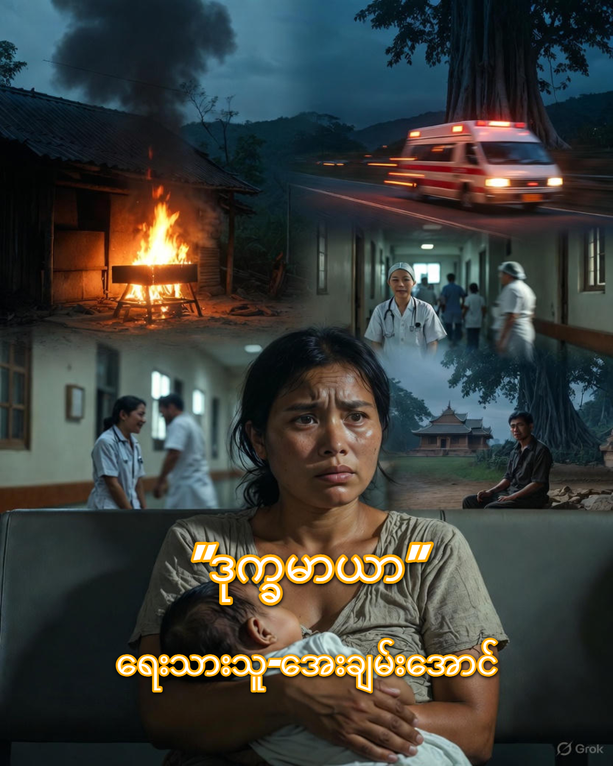စမုံနက်ထုပ်ကို မကြာမကြာ ရှူပေး။ ဒါမှ ခေါင်းမူး မကျန်မှာ” ဒေါ်နန်းအေးသည် သမီးအား တရစပ် ရှင်းပြရင်း မီးကို ဂရုတစိုက်စောင့်ရှောက်ရန် ကောင်းမြတ်လင်းကိုပါ မှာကြားပြန်သည်။ ”ယောက်ျားဖောင်စီး၊ မိန်းမ မီးနေ” ဟု ဆိုသည့်အတိုင်း မီးနေသည် ဇနီးကို အထူး ဂရုစိုက်ပေးရသည်။ ဇနီးမှာ မီးဖွားပြီးစ ဖြစ်သဖြင့် အရာရာကို ကောင်းမြတ်လင်းကသာ လုပ်ပေးရသည်။ နို့တိုက်ရန် သားငယ်ကို ချီပေးရ၏။ ထမင်း၊ ဟင်း ခူးခပ်ပေးရ၏။ စောင်ခြုံပေးရ၏။ အဝတ်အစားလျှော်ဖွတ်ပေးရ၏။ ဆေးဝါးများ တိုက်ကျွေးပေးရ၏။ သားငယ်ကို သေးချေး အနှီးဝတ်များ မကြာမကြာ လဲပေးရ၏။ ဆောင်းရာသီဖြစ်သဖြင့် မီးဖိုကို မီးငြိမ်းမသွား စေရန် အထူးဂရုစိုက်ရ၏။ အိပ်ရေးပျက် များသောကြောင့် ကောင်းမြတ်လင်းမှာ သွေးအားများကျ၍ ပိန်လာသည်။ ညအချိန်တွင် မီးဖိုဘေးတွင် အိပ်ငိုက်လာသည်။ သားငယ်အိပ်နေချိန်တွင် ခဏမှေးအိပ်ရသည်။ သားငယ်ငိုလာပါက ပွေ့ချီ၍ ချော့ရပြန်သည်။ ဇနီးသည် မီးဝင် သည်မှာ ယနေ့နှင့်ဆို ခြောက်ရက်တိုင်ပြီ။ မီးဖိုသိမ်းရန် ဒီတစ်ညသာ လိုတော့သည်။ အိပ်ရေးပျက် သက်သာတော့မည်။ တစ်ည လုံး မီးစောင့်ရသည်မှာ လွယ်ကူသည်တော့ မဟုတ်။ မီးဖိုပေါ်မှ ထင်းချောင်းများကျလာပြီး ဖျာနှင့်စောင်များ မီးမလောင်စေရန်၊ မီးငြိမ်း မသွားစေရန် အထူးဂရုစိုက်ရ၏။ ည ၉ နာရီသာ ရှိသေးသည်။ သူ အိပ်ငိုက် ချင်လာ၏။ နှာစေးနေသဖြင့် မိုးချုပ်ခါစက ဒီကိုဂျင်ဆေးပြား သောက်ထားသောကြောင့် ဖြစ်မည်။ ဇနီးနှင့်ကလေးကို သူကြည့်လိုက် သည်။ အိပ်ရေးငတ်သဖြင့် တရှူးရှူးဖြင့် အိပ်ပျော်နေကြပြီ။ မီးဖိုပေါ်မှ စကတ်သား ထင်းချောင်းမှ မီးကျီးခဲများကြောင့် ဝါးထရံ အခန်းပင်ဖြစ်လင့်ကစား တစ်ခန်းလုံး နွေးနေ သည်။ မီးထိုင်ရန် လုပ်ထားသည့် ယာယီမီးဖို ဖြစ်သဖြင့် မီးဖိုမှာငယ်ပြီး ထင်းချောင်းများက မီးဖိုနှုတ်ခမ်းကို ကျော်လွန်လျက်ရှိသည်။
