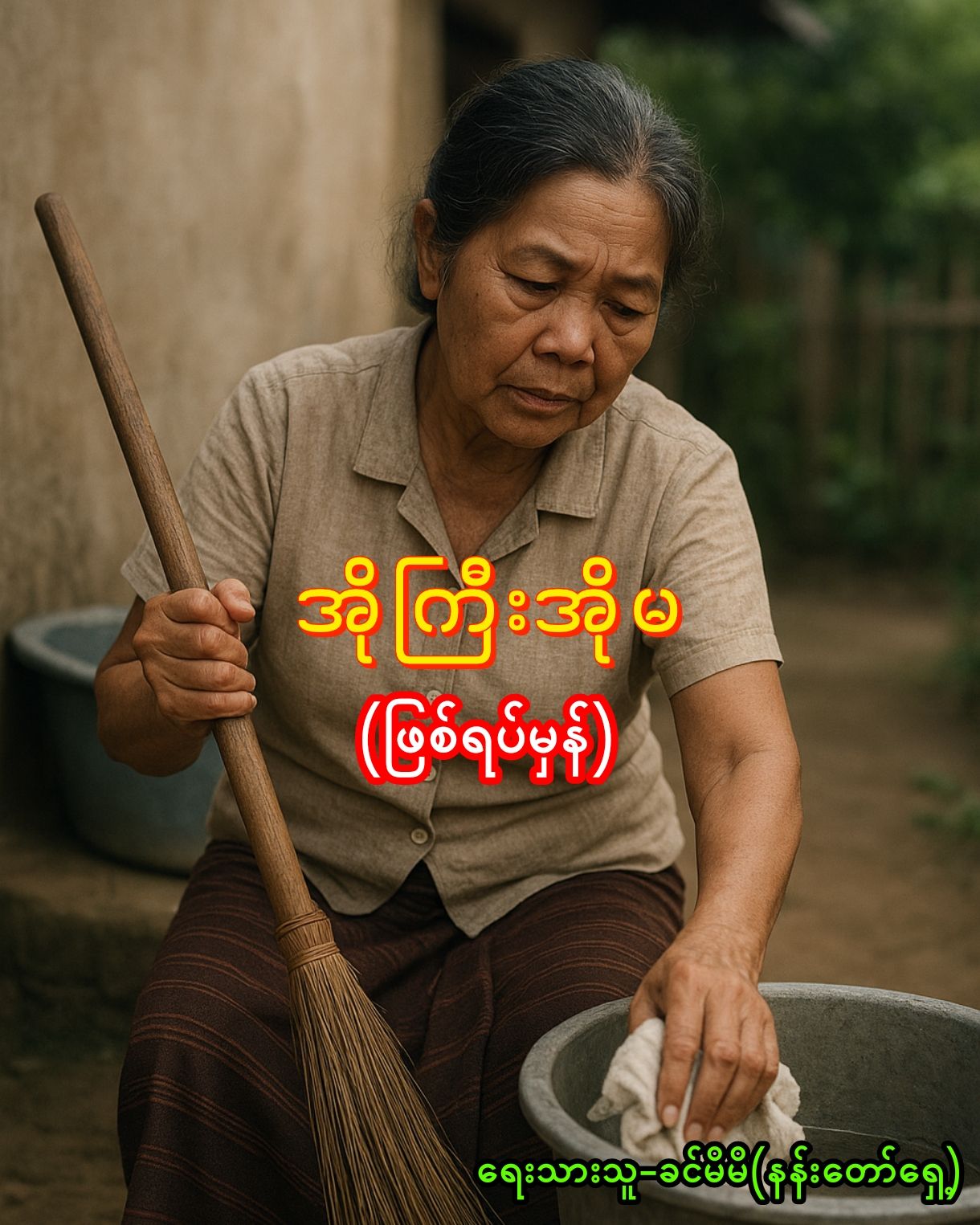 အမေမျက်နှာသစ်ဖို့ ကုတင်ဘေးမှာ ခုံကလေးနဲ့ ရေနွေးခွက် တဘက် တို့ကို ပြင်ဆင်ပေးပြီးတဲ့နောက် ဆွမ်းတော်ဗန်းနဲ့ အိမ်အပေါ်ထပ်တက်လို့ ဆွမ်းကပ်အပြီး အောက်ပြန်ဆင်းလာတဲ့အခါ မယ်မင်းကြီးမ အဲလေ အမေက လက်ထဲမှာ တစ်ရှူးစက္ကူကလေးကိုင်လို့ ကုတင်ခြေရင်းက မိုဘိုင်းတွိုင်းလက်မှာ ထိုင်နေပါရောလား၊