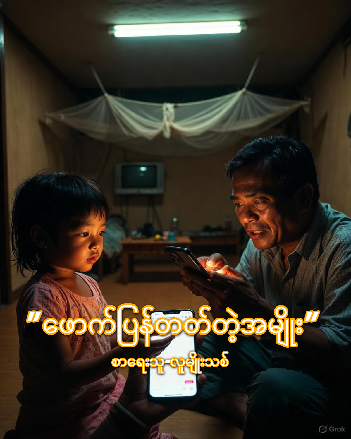 ခုံပေါ် မှာတင်ထားတာတွေ့တယ်။ ပါဝါခလုတ်ကိုနှိပ်လိုက် တယ်။အခုမှဒုက္ခ password နံပါတ်နဲ့ဖြစ်နေတယ်။ ဘယ်လိုမှဖွင့်လို့မရဖြစ်နေတယ်။ ဖုန်းကိုမသိမသာ ပြန်ချပြီး ခေါင်းစားရပြန်တယ်။ သူဖုန်းရဲ့ fb ကိုယူ ကြည့်လို့ရအောင်ဘယ်လိုလုပ်ရမလဲဆိုတာ အချိန် တော်တော်ကြာအောင် စဉ်းစားနေမိတယ်။အဲ့အချိန် မှာ “ဖေကြီး ဂိမ်းဆော့မယ်” “သမီးရယ် မပူနဲ့ကွာ ဖေဖေခေါင်းရှုပ်နေလို့” “ဟင့်အင်း မသိဘူး ဂ်ိမ်းဆော့ချင်တယ်” “သမီးရယ် သမီးဆော့တဲ့ဂိမ်းက သမီးမေမေ ဖုန်းထဲ မှာလေ” ပြောနေရင်းနဲ့ ကျွန်တော့်မျက်နှာတစ်ခုလုံး ပြုံးရွှင် သွားတယ်။ “ဟုတ်ပြီးအခုမှ အကြံရပြီ” ကျွန်တော်သမီးလေးကို ရင်ခွင်ထဲခေါ်ထားလိုက် တယ်။ “သမီး ဖေကြီးပြောမယ်သေသေချာချာနားထောင် သမီးမေမေရေချိုးခန်းထဲကထွက်လာလာချင်း မေမေ ဖုန်းဟိုခုံပေါ်မှာတင်ထားတယ်ယူသွားပြီး ဂိမ်းဆော့ ချင်တယ်ပူဆာ ရအောင်ပူဆာနော် ပြီးရင်ဖေဖေဆီ အဲ့ဖုန်းပြန်ယူလာခဲ့နော်” “ဟုတ်ကဲ့ ဖေဖေ” ပြောလို့မှမကြာသေးဘူး ဇနီးဖြစ်သူ ရေချိုးခန်းထဲက ထွက်လာတယ်။ သမီးလေးတော့ကျွန်တော်ပြောတဲ့ အတိုင်းဂျီကျနေပြီ။ကျွန်တော်ဇနီးလည်း ခါတိုင်းလို ထင်ပြီး ဖုန်းpassword ကိုဖွင့်ပြီးသမီးလေးကိုဂိမ်း ဆော့ဖို့ဖုန်းပေးလိုက်တယ်။