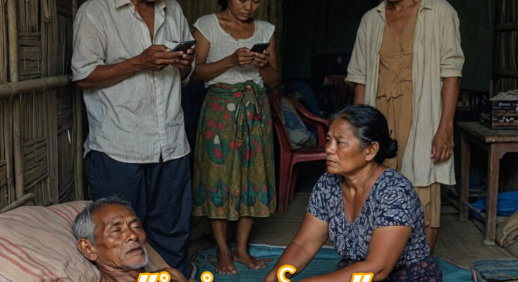 ဖခင်ကြီး တော်တော်ပင် ဝေဒနာခံစားနေရသည် ဟု အကြောင်းကြားလိုက်သောအခါ သားသမီးသားမက် ချွေးမတွေ ရောက်လာ ကြပါသည်။ လောက်လောက်လားလား အရွယ်ရောက်နေကြပြီဖြစ်သည့် ‘မိန်းခလေး မြေးယောက်ျားလေးတွေ တစ်ယောက်မှ မပါလာကြချေ။ ငယ်ငယ်နှောင်းနှောင်း ဘုစုခရုတွေသာ ပါလာကြသည်။ “ခလေးတွေက သူတို ့သူငယ်ချင်းတွေနဲ့ ချိန်းထားကြလို ကတိပျက်မှာ စိုးလို့တဲ့ . . “ကျောင်းစာ အရေးကြီးလို့တဲ့ ” “အိမ်စောင့်မဲ့လူ မရှိဘူး၊ ဒါကြောင့် မခေါ်ခဲ့တာ” “အိမ်သန့် ရှင်းရေး ချက်ပြုတ်ဖွတ်လျှော်ဖို့ အိမ်ဖော်မရှိဘူး ဒါကြောင့် မလိုက်လာနိုင်ဘူး” စသည့် အကြောင်းပြချက်တွေကို သားများနှင့်သမီးများက ပြောကြသည်၊ ချွေးမများနှင့် သားမက်များက မည်သို့ မှ ဖြေရှင်းချက်မပေး၊ ခပ်မဆိတ်နေကြသည်။ ဖခင်ကြီးမကျန်းမာဆိုသောကြောင့် လာသာလာကြသည်။ ဝိုင်းဖွဲ့ပြီး ပါးစပ်ဦးတဲ့ရာ စကားတွေကို ပြောပြသည်။ အဘိုးကြီးအမယ်ကြီးအတွက် မည်သူကမှ စားသောက်ဘွယ်ရာဟူ၍ ယူဆောင်မလာကြ အဘိုးကြီး၊ အမယ်ကြီး အိမ်မှာရှိတာကိုသာစားကြသည်။ အဘိုးကြီ အညစ်အကြေးကို ကိုင်တွယ်သုတ်သင်ရန် မဆိုထားနှင့် အဘိုးကြီ တံတွေးထွေးသည်ကိုပင် ထွေးခံကိုင်ပေးဖော်မရကြချေ။ အမယ်ကြီးကသာလျှင် ထွေးချလိုက်သည့်တံတွေးကို သုတ်ပေး သည်။ ထွေးခံကို ဆေးသည်၊ အဘိုးကြီးအနားမှာ သားသမီးတွေ ရှိခိုက် အဘိုးကြီး လဲလှယ်ထားသည့် အဝတ်တွေကို လျှော်လိုက်ဦးမည် ဆိုခါ သွားလျှော်နေသည်မည်သည့် သားသမီးကမှ အဝတ်တစ်ထည် မလျှော်ပေးခဲ့ချေ။ ထိုအတွင်းကပင် ငွေလိုနေသည့်အတွက် ပိုက်ဆံပေးပါအုံးဟု တောင်းသူကတောင်းသည်။