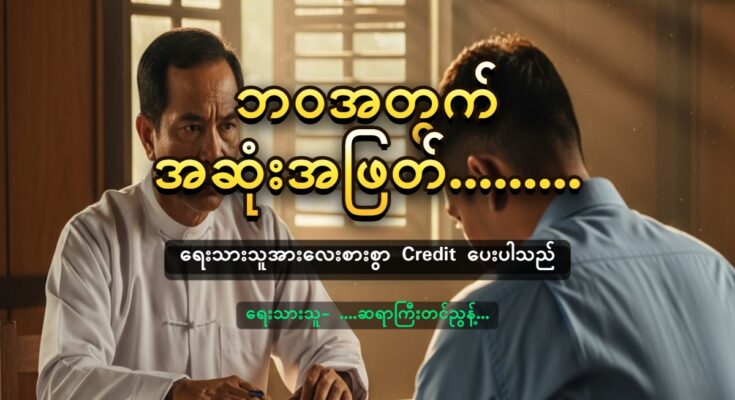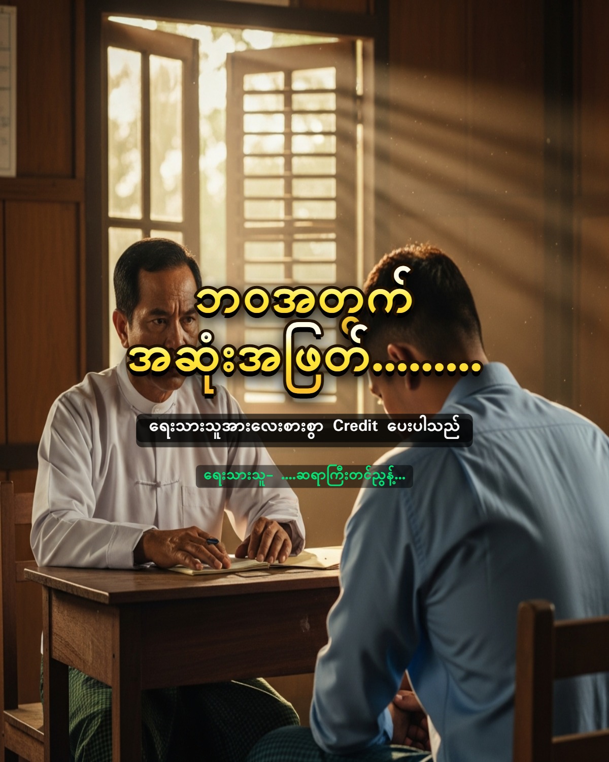 သူ့ဟာနဲ့သူ ကယ်တင်ရှင်က ရောက်လာတာပဲ။ ခုတော့ ခင်ဗျားက ကိုယ့်ကိုယ်ကိုယ် ကယ်တင်လိုက်တာ ဘယ်လောက် ကောင်းထားသလဲ” “ဆရာကြီး ဒါလေး လက်ခံပေးပါခင်ဗျာ” “ဘာတွေလဲ” “ကျွန်တော် တတ်နိုင်သလောက်လေးနဲ့ ဆရာကြီးကို ဂါရဝပြုတာပါ၊ လက်ခံပေးပါနော်” ကိုလေးခန့်က ကျွန်တော့်လက်ထဲကို စာအိတ်လေးတစ်လုံးထည့်ပြီး နောက်တစ်ကြိမ် ကန်တော့သည်။ “ကာယကံ၊ ဝစီကံ၊ မနောကံနဲ့ ပြစ်မှားမိခဲ့တာရှိရင် ခွင့်လွှတ်ပါဆရာကြီး … ဆရာကြီးရဲ့ ဆုံးမစကား တစ်ခွန်းက ကျွန်တော့်ဘဝကို ကယ်တင်လိုက်တာပါ” “ကျွန်တော် ဘယ်လောက်ပဲပြောပြော ကာယကံရှင်က သဘောမပါရင် အလကားပါဗျာ။ ခင်ဗျားကိုယ်တိုင်က သဘောပေါက်လို့ပါ။ ဘဝကို ဒီမှာ မနှစ်မြှုပ်သင့်ဘူးလို့ ခင်ဗျား ရွေးချယ်ချက်က မှန်သွားတာပါ” ကျွန်တော့်အတွက် မမေ့နိုင်သည့် မျက်ရည်ဝဲခဲ့ရသော နေ့တစ်နေ့ ဖြစ်ခဲ့ရပါသည်။