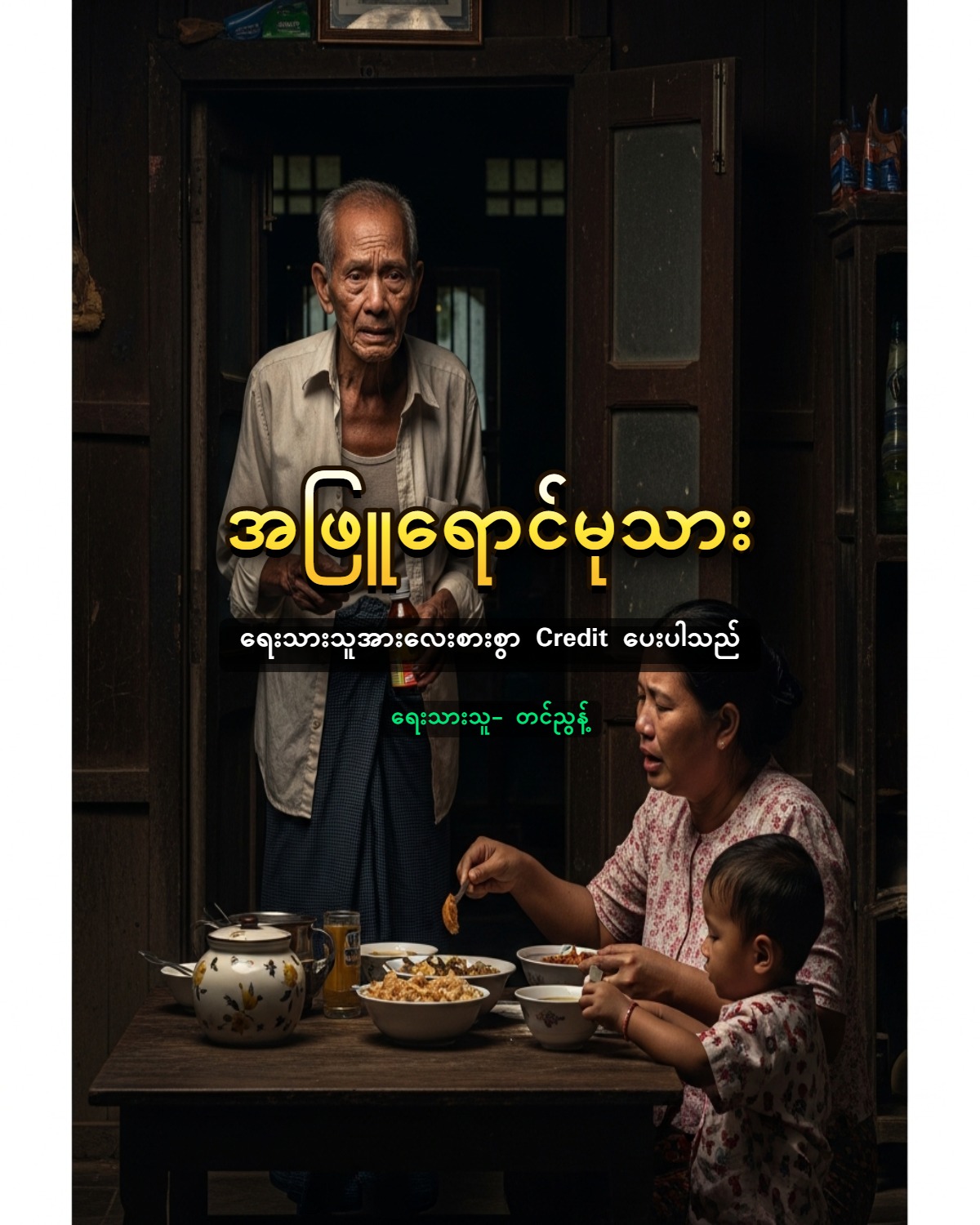 “အဖေ … ထမင်းစားမယ်လေ” သမီးဖြစ်သူက စာရေးနေသည့် ဖခင်ဖြစ်သူကို ထမင်းစားလာခေါ်သည်။ “အေး … အေး … သမီး လာခဲ့မယ်” သူက ရေးလက်စစာကို ဖြတ်လိုက်သည်။ ထို့နောက် စားပွဲမှထကာ ထမင်းဝိုင်းဆီကို လာခဲ့သည်။ ထမင်းဝိုင်းတွင် သူ့တစ်ယောက်တည်းစာကို ပြင်ထားသဖြင့် “သမီး ကလေးတွေရော … မောင်မြင့်ဝင်း ရော” “သမီးတို့ နောက်မှပဲ စားတော့မယ်အဖေ” “ဟဲ့ ခါတိုင်းလည်း မိသားစုနဲ့ အတူတူ စားနေကျပဲ။ ဘာဖြစ်လို့ ခုမှ ငါ့တစ်ယောက်တည်းကို ခူးကျွေးနေရတာလဲ” “သမီးတို့ မဆာသေးလို့ပါအဖေ” သူက ထမင်းဝိုင်းကို ဝင်ထိုင်လိုက်သည်။