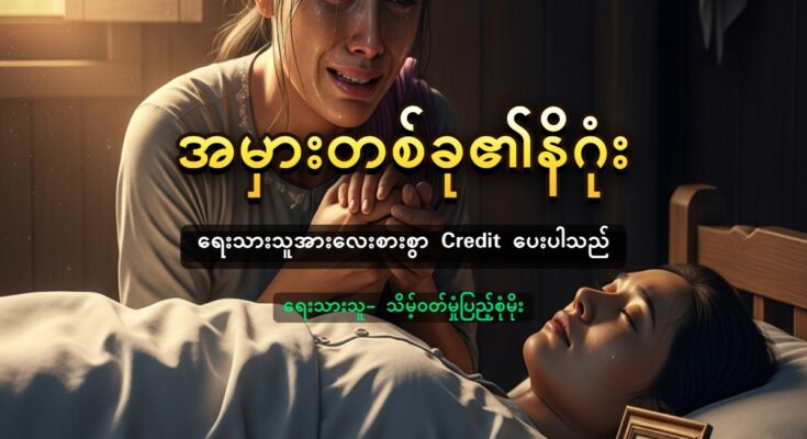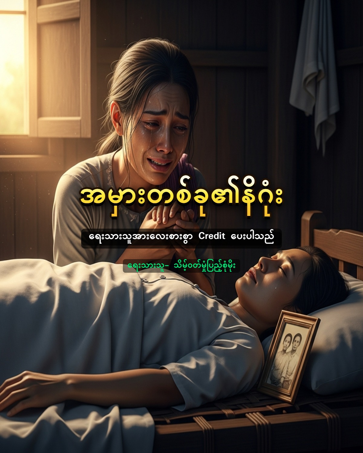 အိပ်ပျော်နေသည်ဟု ထင်မှတ်မှားရလောက်အောင် ငြိမ်သက်စွာလဲလျောင်းနေသည့်�မမ၏အနီးတွင် ကျွန်မ၏ သောကမီးတို့ တငြီးငြီး�လောင်ကျွမ်းလျက်ရှိသည်။ ” မမရယ် … မမ …အဟင့်ဟင့် …�ညီမလေး ခေါ်နေတယ်လေ မမရဲ့။ ထ ကြည့်ပါဦးလား အီးဟီးး ” မဖြေနိုင်ပါ ။�ဖြေနိုင်စရာ အကြောင်းမရှိ ။ ဖြေသိမ့်စရာ စကားလည်း မရှိ ။ မျက်ရည်များသာ ဆက်တိုက် ကျလာ၏။ အဖြစ်ဆိုးနှင့်ကြုံခဲ့ရသော မမကိုကြည့်ပြီး၊ ကျွန်မရင်တွေ နင့်နေသည်။ ဝမ်းနည်းလုံးကြီး ဆို့တက်နေ၏။ မမ…�ကျွန်မ၏ တစ်ဦးတည်းသော မမ။ ” ဖြစ်မှဖြစ်ရတယ် မမရယ်… မမပြောတော့ အဆင်ပြေတဲ့တစ်နေ့ ညီမလေးကို လာခေါ်မယ်ဆို။ စောင့်နေတယ် လေ မမရဲ့ ။ ညီမလေး စောင့်နေတာ … ” ရင်ထဲရှိသမျှပြောကာ�ဝမ်းပမ်းတနည်း ငိုကြွေးနေသည့် ကျွန်မ၏အနားသို့ ဖေဖေတို့လင်မယား ရောက်လာသည်။ ” သမီးငယ် … ” ငိုသံစွက်နေသည့် ဖေဖေ့အသံ ။