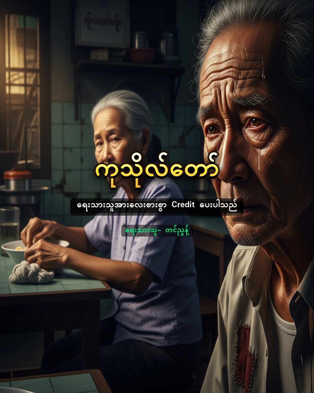 အဘွားအိုက သူ့ရှေ့ကပန်းကန်ကို အဘိုးအိုရှေ့သို့ တိုးပေးလိုက်ရင်း “ရှင်စားလေ” ဟု ပြောလိုက်သည်။ အဘိုးအိုကလည်း “နင်ပဲစားပါ … ငါကမဆာသေးဘူး” ဆိုကာ ပန်းကန်ကို အဘွားအိုရှေ့ ပြန်တွန်းပေးလိုက်သည်။ အဘွားအိုက ထမင်းပန်းကန်ကိုသူ့ရှေ့ဆွဲကာ တစ်ဇွန်း စားလိုက်ပြီးနောက် အဘိုးအိုရှေ့ ပြန်တွန်းပေးပြီး “ရှင်လည်းစား” ဟုပြောလိုက်သည်။ အဘိုးအိုက “ငါရင်ခံနေလို့ပါကွယ်” ဟုပြောလိုက်သည်။ သို့သော် သူ့မျက်လုံးတွေက အဘွားအို၏ ပန်းကန်ထဲမှ ဝက်သားတုံးတွေကို ကြည့်နေသည်။ တစ်ဖက်စားပွဲဝိုင်းတွင်ထိုင်ကာ ငါးဖယ်နှင့်စားနေသော အဘွားအိုက ဆိုင်၏ကောင်တာဆီကိုထသွားပြီး တစ်ခုခုပြောလိုက်သည်။ မကြာမီ စားပွဲထိုးကောင်မလေးက ပန်းကန်တစ်ချပ်နှင့်ထမင်းပွဲပြင်ကို အဘိုးအိုရှေ့လာချသည်။