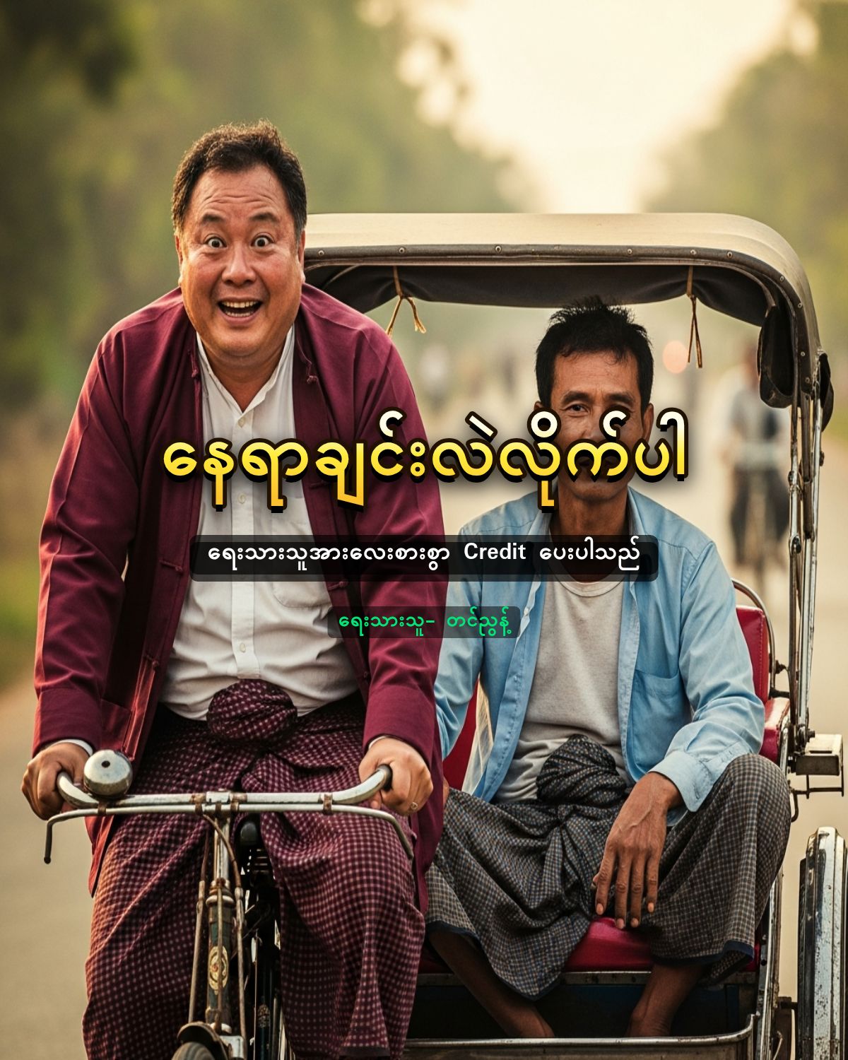 ကျုပ်လို ဆိုက်ကားနင်းပြီး လေချွန်ကြည့်လိုက်။ ပိုက်ဆံတစ်ပြားမှ ထပ်ပေးစရာ မလိုဘူး” “ငါမှဆိုက်ကားမနင်းတတ်တာ” “ခင်ဗျား စက်ဘီးစီးတတ်လား” “မစီးတတ်ဘူး” “ရပြီ … စက်ဘီးမစီးတတ်တဲ့သူဆိုရင် ဆိုက်ကားနင်းဖို့ အထူးသင်စရာမလိုဘူး။ လာပါ နင်းကြည့်လိုက်ပါ” ဆိုက်ကားဆရာက ဆိုက်ကားကို ရပ်လိုက်သည်။ ဆိုက်ကားပေါ်က ဆင်းလိုက်ပြီး ဖယ်ပေးလိုက်သည်။ “လာပါ နင်းကြည့်စမ်းပါ” သူဌေးကြီးက သူ့အိတ်ကိုပိုက်ကာ ဆင်းလာပြီး “ဒီအိတ်ကို ဘယ်မှာထားရမလဲ” “ကျုပ်ကိုပေးထားပါ။ ခင်ဗျားအိတ်ကို ယူမပြေးပါဘူး” လူကြီးက ဆိုက်ကားသမားကို ပိုက်ဆံအိတ်ပေးသည်။ ဆိုက်ကားပေါ်တက်ခွသည်။ ဆိုက်ကားသမားက ခရီးသည်ထိုင်သည့်နေရာတွင် အိတ်ကိုပိုက်ပြီးထိုင်သည်။