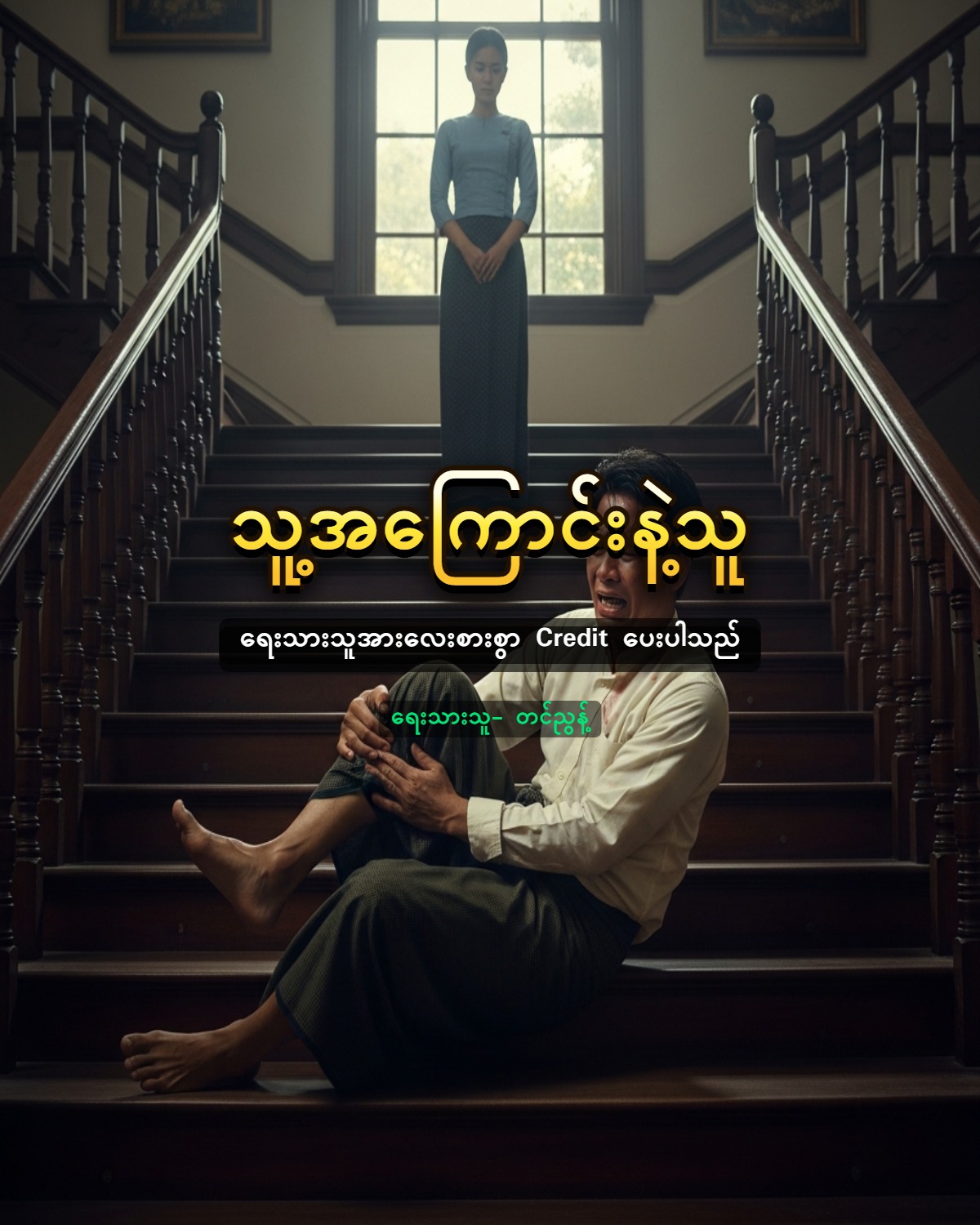 အဲဒီသေတမ်းစာ အဓိပ္ပာယ် မရှိဘူး” “ဒီမှာ မောင်ရင် အဲဒီ သေတမ်းစာရေးတုန်းက သက်သေအဖြစ် ဟောဒီမှာ ထိုင်နေတဲ့ လူကြီးမင်းတွေ အားလုံး ပါတယ်။ သူတို့ရှေ့မှာ သေတမ်းစာကို ရေးတယ်။ ဖတ်ပြတယ်။ လက်မှတ်ထိုးခဲ့ကြတယ်” “အဲဒီသေတမ်းစာကို လက်မခံဘူး။ ကျုပ်တရားရုံးမှာရင်ဆိုင်မယ်” ခင်မောင်သန်းသည် ဒေါနှင့်မောနှင့်ပြောကာ ထွက်သွားသည်။ သူတို့အားလုံး အပေါ်ထပ်ဧည့်ခန်းတွင် စကား ပြောနေခြင်းဖြစ်ရာ ခင်မောင်သန်းက လှေကားနားအရောက်တွင် ခင်းထားသော ကော်ဇောကိုခလုတ်တိုက်ပြီး လှေကားအောက်ကို လိမ့်ကျသွားသည်။ အားလုံး လှေကားအောက်ကို ပြေးလိုက်ကြသည်။ “ခင်မောင်သန်း … ခင်မောင်သန်း” “ဘာဖြစ်သွားသေးလဲ” “အား … အား … ကျွန်တော့်ခြေထောက်တွေ ထောက်လို့မရတော့ဘူး … လုပ်ကြပါဦး” ထိုအချိန်တွင် အိမ်ဖော်မလေး နော်အေးချမ်းက ခင်မောင်သန်း လွှင့်ပစ်ထားသည့် ချိုင်းထောက်ကိုယူကာ အိမ်ပေါ်က တစ်လှမ်းချင်း ဆင်းလာသည်။ ထိုအချိန်တွင်ပင် ခင်မောင်သန်းအဖေသည် အိမ်တွင်သေဆုံးသည်။