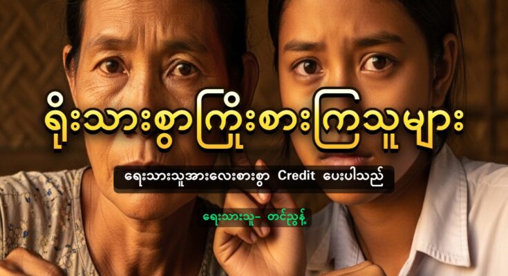 လူကြားထဲမှာပြောလို့တဲ့ သမီးကရှက်ပြီး ပြန်လာတယ်” “အေးပါ ကိုယ့်အပြစ်တွေပါကွယ်။ သမီးနဲ့ဇနီးကိုကောင်းကောင်းမွန်မွန် မထားနိုင်တာ ကိုယ့်အပြစ်တွေပါ” “ဘယ်ဟုတ်မလဲအစ်ကိုရယ်။ အိမ်ထောင်တစ်ခုမှာ လှည်းဘီးကနှစ်ဘီးရှိတာ တစ်ဘီးက ပြုတ်နေလို့ သည်လို ဖြစ်ရတာပါ။ အစ်ကို တစ်ယောက်တည်း ရုန်းကန်နေရတာ ဘယ်အဆင်ပြေပါ့မလဲ။ ကျွန်မအလုပ်ထွက် လုပ်မယ် ဆိုတော့လည်း အစ်ကိုက လက်မခံဘူး” “မဖြစ်ပါဘူးကွယ်။ ကိုယ်ကြံပါဦးမယ်” “သမီးလေးကိစ္စဘယ်လိုဖြေရှင်းပေးကြမလဲ” “သမီးလေးကို ကိုယ်သွားပြောပါ့မယ်ကွာ” ကိုတိုးအောင်က သူ့သမီးလေး အခန်းထဲကိုဝင်သွားသည်။ “သမီးလေး ကျောင်းလခတောင်းနေပြီဆို” “ဟုတ်တယ်ဖေဖေ … ဖေဖေရယ် ကျောင်းလခ မပေးရတဲ့ကျောင်းကိုပဲပြောင်းနေချင်ပြီ။
