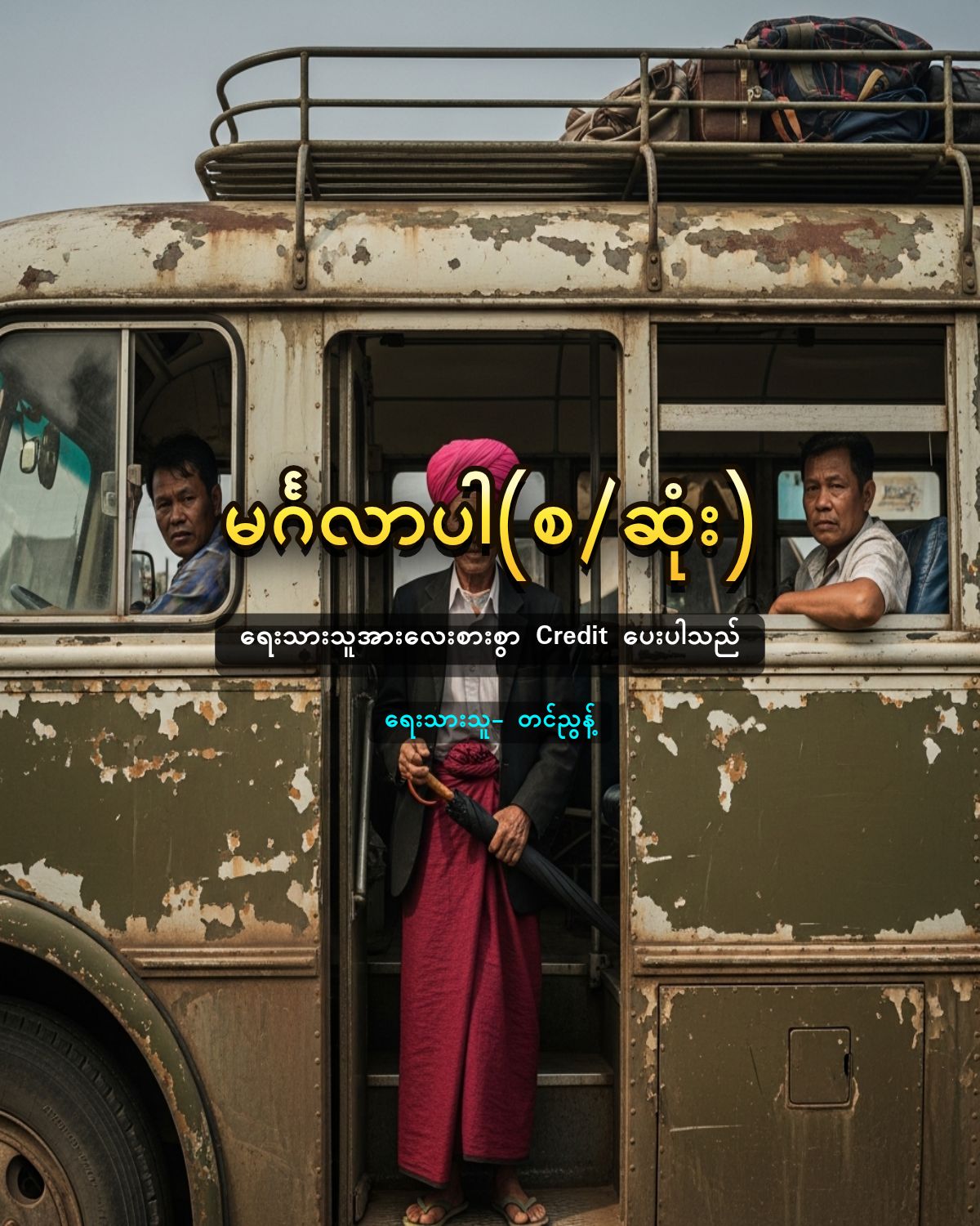 “ဟိုးထား … ဟိုးထား” ပန်းနုရောင်ခေါင်းပေါင်း၊ သျှောင်တစောင်းနှင့် လွယ်အိတ်ကြီးတစ်လုံးကို လွယ်ထားသည့် ပိန်ပိန်ရှည်ရှည်၊ ဖြူဖြူနုနု လူတစ်ယောက်က ပြေးလာသည်။ သူ့ တိုက်ပုံက အနက်ရောင်၊ ပုဆိုးက ကြက်သွေးရောင်နှင့် မည်သို့မျှ မလိုက်ဖက်။ လက်ထဲတွင်လည်း ကြက်ဆင်ဖဲထီးနက်ကြီးကို ကိုင်ထားသေးသည်။ ကားက ဘရိတ်ဆွဲသံထွက်လာသော်လည်း သုံးပေခန့်ဒယဉ့်တိုက်ဆွဲပြီးမှ ရပ်သွားသည်။ စပယ်ယာက “လိုက်မယ်ဆိုလည်း စောစောစီးစီး မလာဘူး …တကတဲ” ဟု ဆိုသည်။ ကားပေါ်တွင် ဈေးသည်၊ လက်လုပ်လက်စား၊ တံငါ၊ ပန်းပဲ၊ ကြက်သမား၊ ဝက်ထိုး လူမျိုးစုံပါလာသည်။ ထိုသူတွေက ဖြစ်သလိုဝတ်ထားကြသည်။ အချို့က ညအိပ်ရာဝင်ကတည်းက ဝတ်ထားသည့် အဝတ်အစားများ ဖြစ်မည်။ တွန့်ကျေနေသည်။