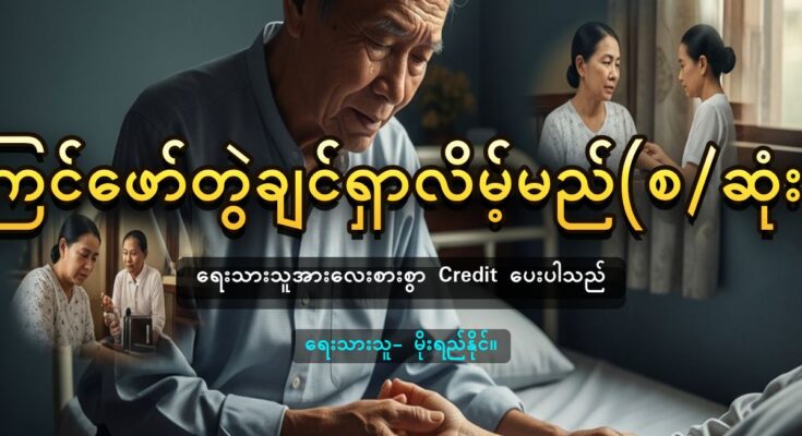 “သတို့သမီးရဲ့အရပ်ဒေသကထုံးတမ်းစဉ်လာတွေတော့သိရပါပြီ၊သတို့သားရှင်ဘက်ကအဓိကသိချင်မှာကမင်္ဂလာစရိတ်ခန့်မှန်းချေဘယ်လောက်ကုန်မလဲဆိုတာဖြစ်ပါလိမ့်မယ်” “သူမေးချင်သောမေးခွန်းကိုရပ်ကွက်လူကြီးတစ်ယောက်ကမေးလိုက်သည်။သူရှာဖွေထားသောငွေနှင့်လောက်မလောက်ချင့်ချိန်ရမည်။မိဘကငွေကြေးမပြည့်စုံသဖြင့်သားမျက်နှာငယ်ရမည့်ကိုလည်းစိုးရိမ်သည်။ “ကျွေးမွေးတာ၊ကန်တော့်ပွဲ၊ရပ်ကြေးရွာကြေးနဲ့ဆိုတော့အနည်းဆုံးသိန်းသုံးဆယ်လောက်ကုန်ပါလိမ့်မယ်” သူခေါင်းတော်တော်ချောက်သွားသည်။သူမှန်းထားသည်ကသိန်းနှစ်ဆယ်၊ပိုပိုမိုမိုသိန်းအစိတ်ရှာထားသည်။ခုအနည်းဆုံးသိန်းသုံးဆယ်ခန့်ကုန်မည်ဆိုသောအခါလိုသောငွေကိုမည်သို့ရှာရမည်ကိုအပြေးအလွှားစဉ်းစားရသည်။ခင်မေ့အတွင်းပစ္စည်းတွေကိုတော့မရောင်းရက်။အိမ်ဝန်းတစ်ခြမ်းကိုရောင်းလျှင်ရနိုင်သော်လည်းအမြန်ရောင်းထွက်ဖို့မလွယ်။မင်္ဂလာစရိတ်မတတ်နိုင်သဖြင့်ပွဲပျက်ရမည့်အဖြစ်မျိုးလည်းအဖြစ်မခံနိုင်။အားလုံး၏အကြည့်တွေကသူ့ဆီရောက်နေသည်ကိုသိလိုက်သည်။ “အမှန်အတိုင်းပြောရရင်သိန်းအစိတ် လောက်ကုန်မယ်မှန်းပြီးရှာထားပါတယ်။မလောက်နိုင်ဘူးဆိုတာသိရတော့ရုတ်တရက်ရှာဖို့ခက်သွားပါတယ်။