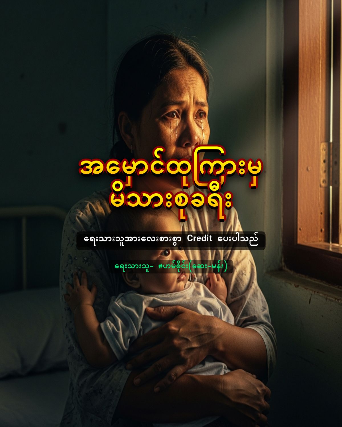 သူမဟာ မောင်မြတ်ကို တင်းတင်းဖက်ထားလိုက်ရာ သူ့ရဲ့ ကိုယ်လေးဟာ လက်ထဲမှာ တုန်ယင်နေခဲ့ပြီး၊ ရက်စက်လွန်းတဲ့ ဒီဘဝကို နားလည်အောင် ကြိုးစားနေခဲ့ရရှာတယ်။ တစ်ချိန်က သားချော့တေးတွေ၊ ပျော်စရာ အရုပ်တွေနဲ့ ပြည့်နေတဲ့ ကလေးအခန်းလေးဟာ ဆေးရုံအခန်းအဖြစ် တစ်ညတည်းနဲ့ ပြောင်းလဲသွားခဲ့တယ်။ ရယ်သံတွေနေရာမှာ စက်သံတိုးတိုးတွေ နေရာယူလာပြီး၊ ဆေးသွင်းပိုက်တွေ၊ ကီမိုပိုက်တွေက ကလေးငယ်ရဲ့ အပြစ်ကင်းတဲ့ ကစားစရာတွေကို အစားထိုးခဲ့တယ်။ မော်နီတာက ထွက်ပေါ်လာတဲ့ အသံတိုင်းဟာ သားငယ်ရဲ့ နုနယ်တဲ့ အသက်ကို မခင်ခင်ကို သတိပေးနေပေမယ့်၊ မောင်မြတ်ရဲ့ မျက်လုံးထဲမှာတော့ “အလင်းရောင်တစ်ခု၊အရှုံးမပေးတဲ့ ရဲစိတ်”ကို သူမ မြင်တွေ့နေခဲ့ရပါတယ်။ ဆေးရုံမှာ ပထမဆုံး ရက်တွေက စစ်ဆေးမှု၊ ဆေးထိုးမှုနဲ့ ဆေးနံ့တွေကြားမှာ မှတ်ဉာဏ်တွေ ဝေဝါးနေခဲ့တယ်။ မခင်ခင်ဟာ မောင်မြတ်ရဲ့ ဘေးနားမှာ အချိန်အတော်ကြာ ထိုင်ပြီး သူ့ရဲ့ ဆံပင်နုနုလေးတွေကို ပွတ်သပ်၊ မျက်ရည်ကြားကနေ ဆုတောင်းနေခဲ့တယ်။ ” ၊ နောက်ထပ် တစ်ရက်လေးပဲ အသက် ရှင်သန်ပေးပါဦးဘုရား” လို့ ပိုးသတ်ဆေးနံ့တွေ ပြည့်နေတဲ့ အခန်းထဲမှာ သူမ မျှော်လင့်ချက်ကို တိုးတိုးလေး ရေရွတ်ခဲ့ပါတယ်။
