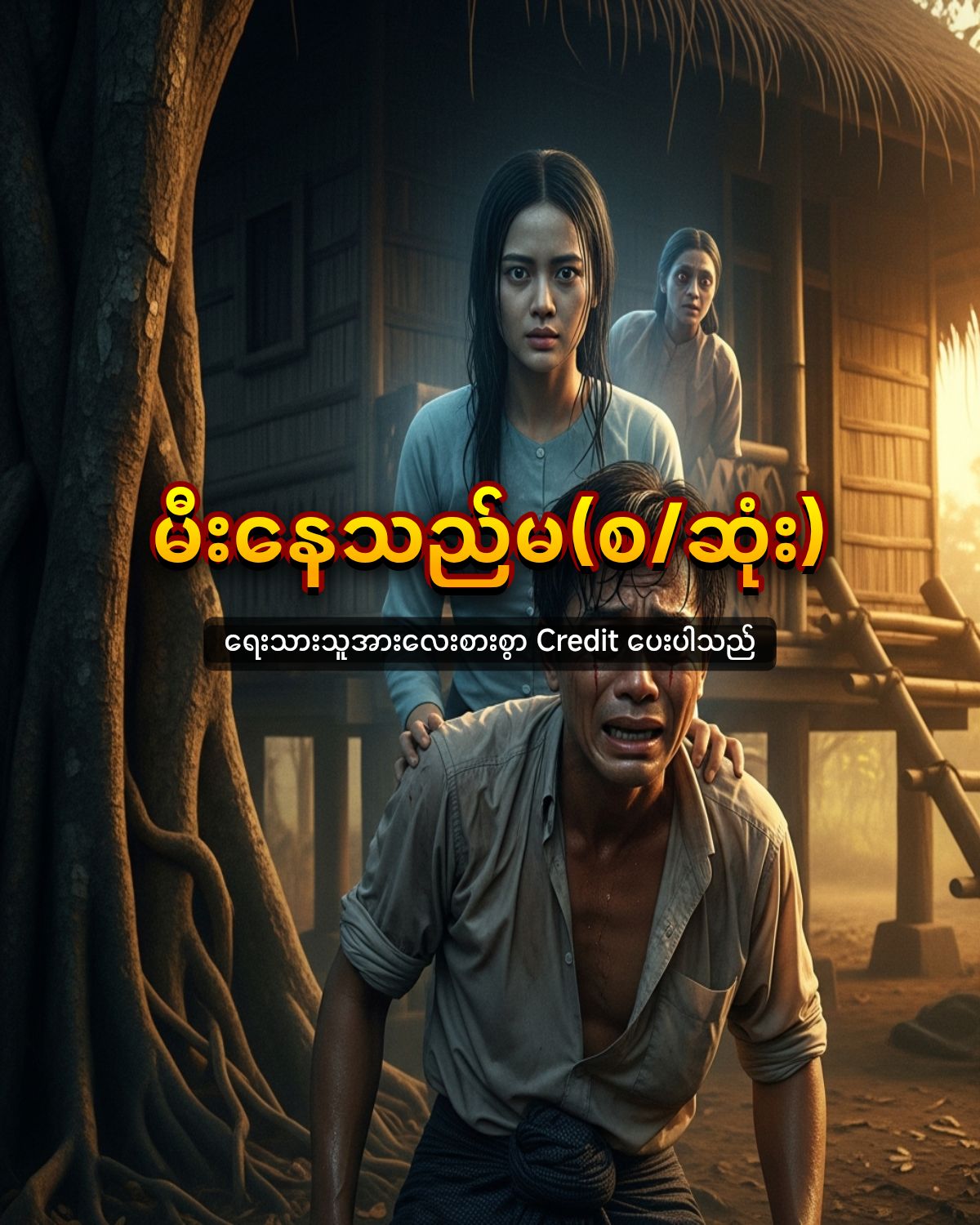 ” အမေ အမေ အစ် အစ် ” ” ဟဲ့အကောင် ဘာဖြစ်လာတာလဲ ” ” အမေ အမေ ဂျမ်းပုံ သ သ သရဲ သရဲ ” ” ဟဲ့ ဘယ်ကသရဲတုန်း ” အမေကိုပြန်မဖြေအားပဲ ဘုရားစင်မှ ဘုရားသောက်တော်ရေကို ဂွတ်ခနဲမော့ချလိုက်ပီး နောက်တစ်ခွက်ကို ခေါင်းပေါ်ကလောင်းချလိုက်ပြီးနောက် အတန်ငယ်တည်ငြိမ်သွားဟန်ဖြင့် ” အမေ ဂျမ်းပုံ မကျွတ်ဘူး ” ” သူ့ကလေးချီပီး ကျွန်တော့်ကိုစိုက်ကြည့်နေတာများ အမေရယ် လိပ်ပြာလွင့်မတတ်ပဲ ” ” အခုထိမျက်လုံးထဲပြန်မြင်ယောင်နေသေးတယ် ဘုရား ဘုရား ” ” ဟုတ်ရော ဟုတ်ရဲ့လား သားရယ် ” ” အာ အမေ့ကိုလိမ်စရာလားဗျ ” ထိုသတင်းကနောက်နေ့ တစ်ရွာလုံးပြန့်သွားတော့သည်။ ♬ ♪ ညနေ နေရီ နေရီ ရေခပ်ချိန်လေးနီးလာပြီ ♪ ♬ ♬ ကိုအောင်သူတို့ သူငယ်ချင်း ၂ယောက် ကိစ္စဖြင့်ဒီရွာရောက်ပီး ရွာခံတွေက ပြုစုသဖြင့်ရွာသို့ပြန်ရန်အချိန်အတော်ပင်လင့်သွားသောကြောင့် မူးမူးဖြင့် တမာပင်တန်းက ဖြတ်ပြန်လာကြသည်။လက်ထဲတွင်လဲ ကန်ဖော်လို့ပေးလိုက်သော ငါးရံ့ ၃ ကောင်ကိုဆွဲလာကြစဉ် ” အောင်သူ ငါ့နှာခေါင်းထဲ ဆနွင်းနံ့ရသလိုပဲ ” ” ငါမရပါဘူးကွာ မင်းကလဲ ဒီချိန်ကြီး ဘယ်က ဆနွင်းကရှိမှာလဲဟ ” တမင်ပင်တန်းကိုကျော်လာစဉ် ငါးတွဲကိုဆတ်ခနဲဆွဲလိုက်သဖြင့် နောက်ပြန်လှည့်ကြည့်ရာ ကလေးချီထားသောမိန်းမတစ်ယောက် လက်တစ်ဖက်ဖြင့် ငါးတွေကို အစိမ်းလိုက်စားနေလေရာ ” ဘာလုပ်တာလဲ ကောင်မ ပြန်ပေးစမ်း ” ” ဟီး ဟီးး ဟီးးးး ” ခြောက်ခြားဖွယ်ရာရီသံကြီးနဲ့အတူ ထိုမိန်းမသည် တမာပင်ပေါ်သို့ မတ်တတ်ကြီး လမ်းလျှောက်တက်သွားသဖြင့် ” ဟေ့ရောင် ပြေးပြေး သရဲကွ သရဲ ” ဟုဆိုကာသောက်ထားသောအရက်ရှိန်တွေပင် ဘယ်ပျောက်ကုန်သည်မသိ ခွေးပြေးဝက်ပြေး ပြေးတော့သည်။