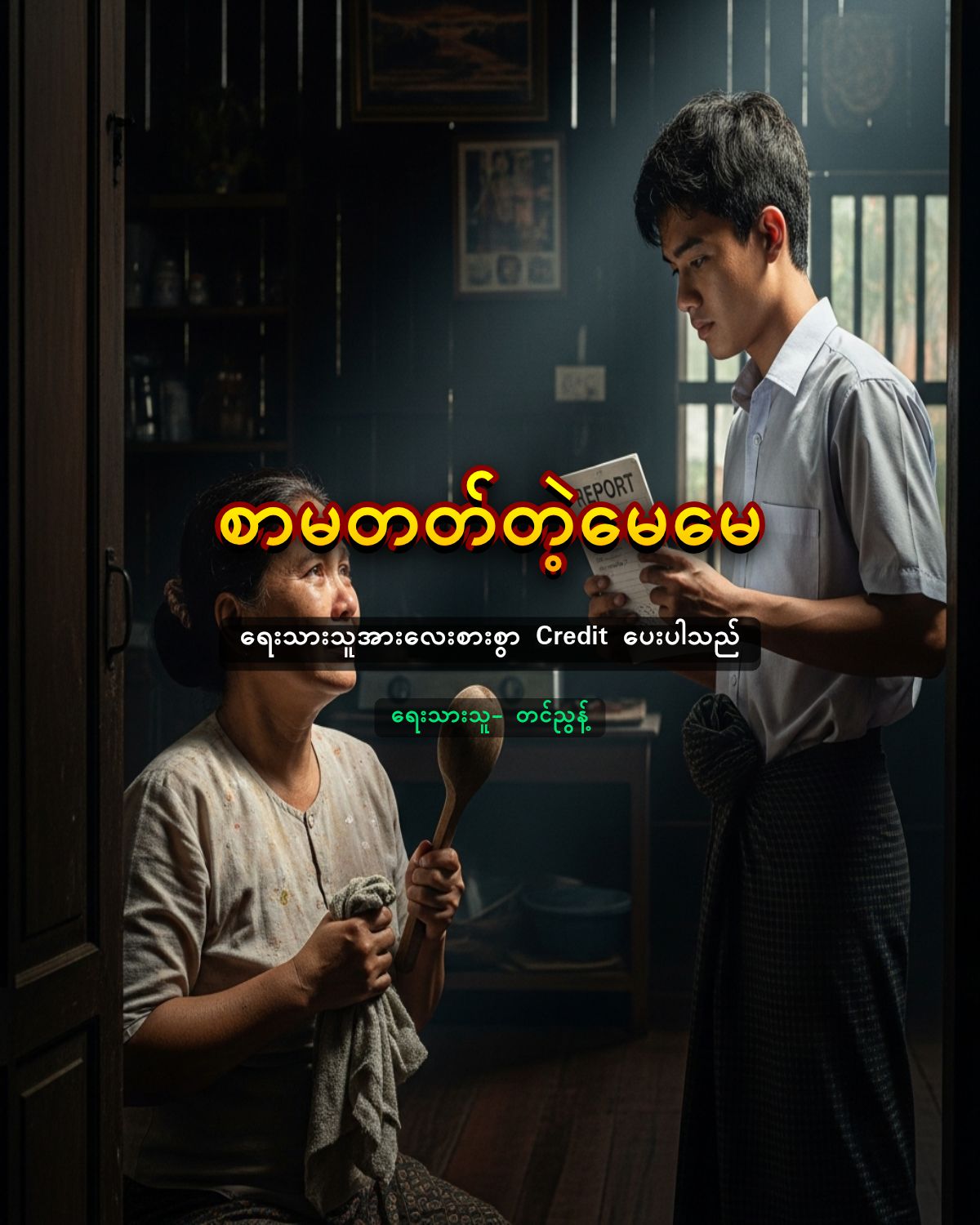 မီးဖိုခန်းထဲမှ ဟင်းချက်ဇွန်းတစ်ဖက်၊ လက်နှီးစုတ်တစ်ဖက်ကိုင်ကာ မိခင်ဖြစ်သူက ထွက်လာသည်။ “ဘာလဲတော့” “ဒီမှာလေ မင်းသားက ဘာသာစုံ အမှတ် ၉၀ အထက်မှာချည်းပဲ” “ဟုတ်လား ကြည့်စမ်းပါရစေဦး … ကျွန်မကို ပြပါရှင့်” သားဖြစ်သူက သူ့ဖခင်လက်ထဲမှာ ကတ်ပြားကို ဆွဲယူလိုက်ကာ “အို ဖေဖေ ကလည်း မေမေ့ကိုပြလို့ ဘာထူးမှာလဲ … မေမေက စာမှမတတ်တာ” ဖခင်က စိတ်ဆိုးသွားပြီး “ဟေ့သား ဘယ်လိုများပြောလိုက်တာလဲ” မိခင်ဖြစ်သူ မျက်ရည်တွေဝဲနေသည်။ ဖခင်က သူ့သားကို ဆက်ပြောသည် “ဟုတ်တယ် မင်း အမေစာမတတ်ဘူး … ဟုတ်တာပေါ့” ဖခင်က စကားကို ခေတ္တရပ်လိုက်ပြီး ဆက်ပြောသည်။ “ဒါပေမဲ့ သား … မင်းသိထားရမှာက …” “မင်းကို မမွေးခင်က … မင်းဗိုက်ထဲမှာတုန်းကပြောတာ။