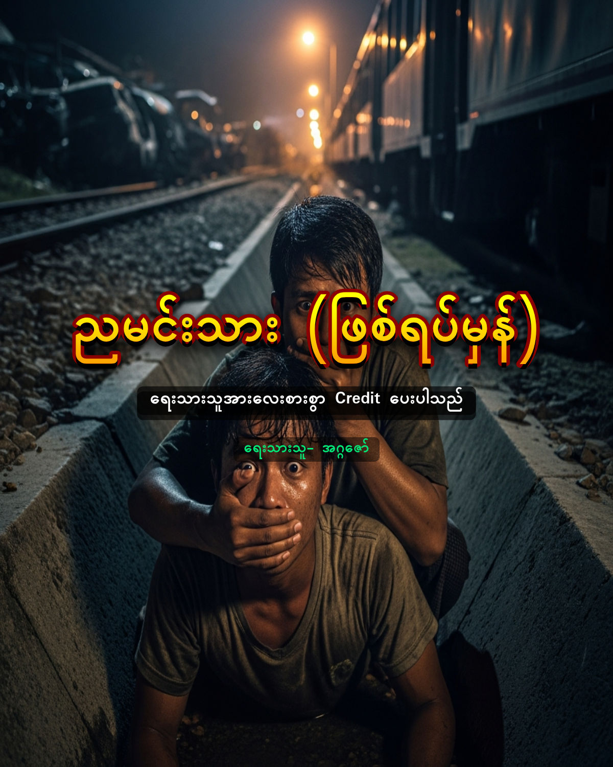 သူတို့ဘေးတွင် ရေမြောင်းကြီးသာရှိသည်။ မိုးကုန်သဖြင့် ကွန်ကရစ်ရေမြောင်းကြီးသည် ရေတွေမရှိတော့ဘဲ အမှိုက်တွေသာရှိသည်။ ရေမြောင်းများ ကျယ်လဲကျယ်ပြီး ငါးပေခန့်နက်သည်။ မြင့်သူလဲ ထိုအထဲခုန်ချလိုက်သည်။ အခြားသူများလဲ လိုက်ပြီးခုန်ချသည်။ ထို့နောက် ရေမြောင်းထဲမှနေ၍ အသာချောင်းကြည့်ကြသည်။ ထိုအရိပ်တွေက ကားပေါ်မှ ခုန်ချပြီး လမ်းဘေးတွင် မလှုပ်မယှက်ရပ်နေကြသည်။ မကြာမီ ထိုဒိုင်နာနောက်ဘက်ရှိ ဟိုင်းလပ်ကားလေးပေါ်မှ လူ၃ယောက်ခုန်ဆင်းလာပြန်သည်။ သူတို့အားလုံးကြည့်သာကြည့်နေရသည် ခေါင်းမွှေးတွေထောင်နေပြီးတော့ ကျောတွေလဲချမ်းနေပြီဖြစ်သည်။ မကြာခင်ခွေးတွေထိုးဟောင်သံများ၊ အူသံများကိုကြားလိုက်ရသည်။ မောင်ခိုင်က လက်ကနာရီကို ငုံ့ကြည့်လိုက်သည်။ နာရီတွင်ပါသည့် မီးလင်းသည့် ခလုပ်လေးကို နှိပ်လိုက်သည်။ ၁၁ နာရီ ၄၅ မိနစ်။ “ဒါ . .ဒါ ညမင်းသား လာတဲ့အသံပဲ” သူတို့အားလုံး မလှုပ်မယှက်ဖြင့် မြောင်းထဲတွင် အသက်တောင်ကျယ်ကျယ်မရှုရဲပဲ ကြည့်နေကြသည်။ ခြင်တွေကလဲ သူတို့ကို တဝီဝီဖြင့် ကိုက်နေကြသည်။